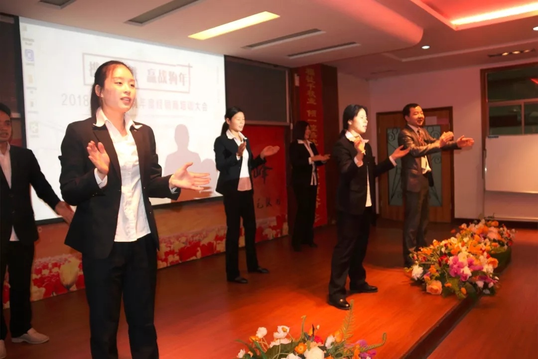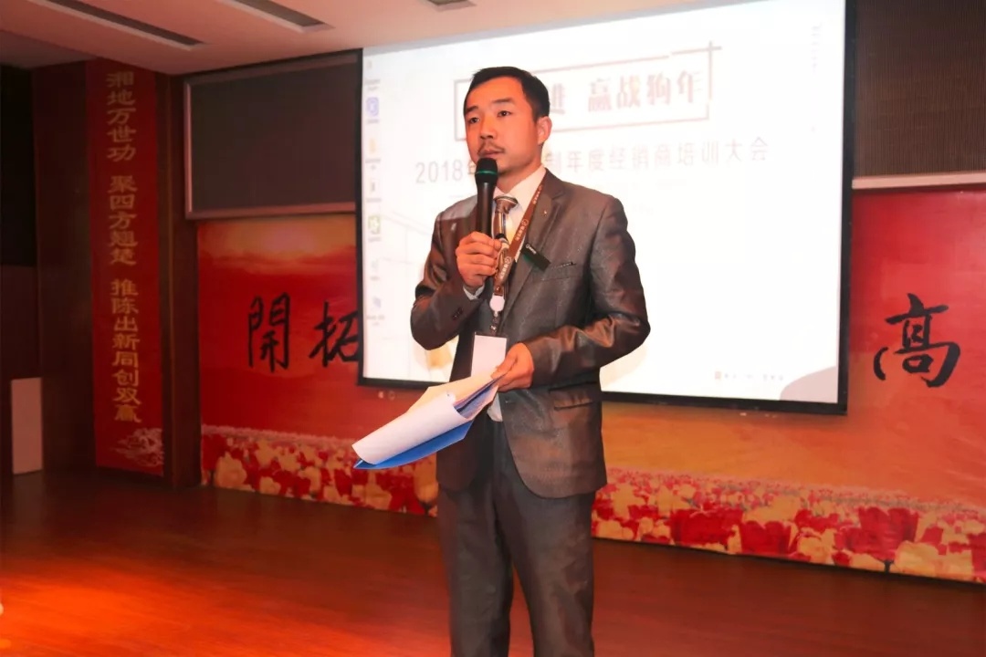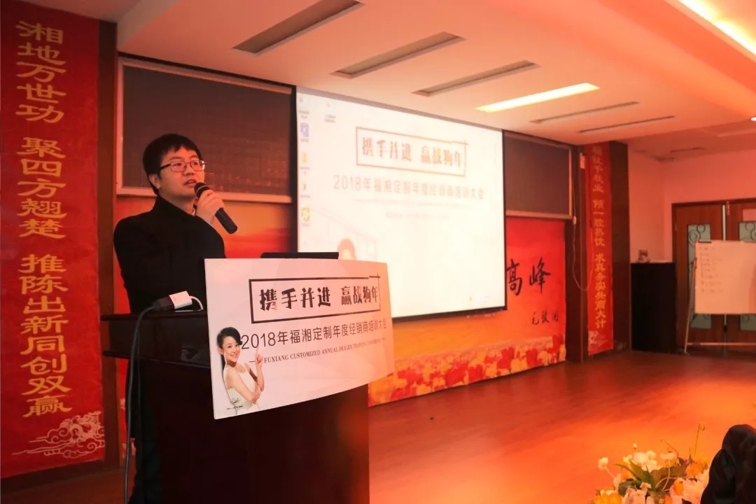 福湘集团董事、福湘定制总经理张博先生致欢迎辞,发言总结2017年福湘定制所取得的成败得失,揭开了2018年福湘定制发展的新目标、新任务、新要求,赢得在场人员掌声轰鸣!